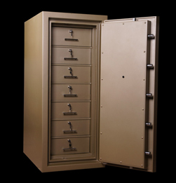 Merupakan pengembangan produk dari Document Safe yang mempunyai ketahanan yang lebih terhadap ancaman pencurian & pembongkaran yang menggunakan peralatan las oxy-acetylene, bor & peralatan mekanik lainnya. Disekeliling pintu dilengkapi "Fire Blocking Construction" yang memberikan keamanan tinggi terhadap api. sangat cocok untuk di pakai pada lembaga Keuangan seperti Leasing, Finance, BPR, Koperasi Simpan Pinjam & Juga Perbankan. Tebal Badan : 90 mm Tebal Pintu : 130 mm Tebal Lapisan Pelindung Pintu : 60 mm Pengunci : Kunci kombinasi 3 Roda + Kunci 6 Lever, Checklocking Dial, Spy Proof Ring |